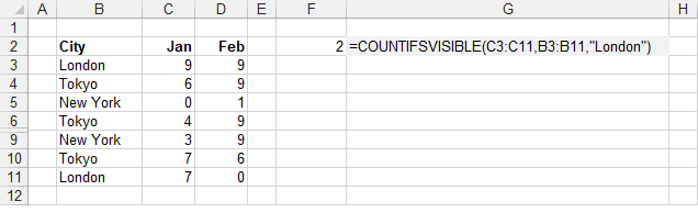 | | A | | 1 | =JS.COUNTVISIBLEIFS(A2:A8,"London") |