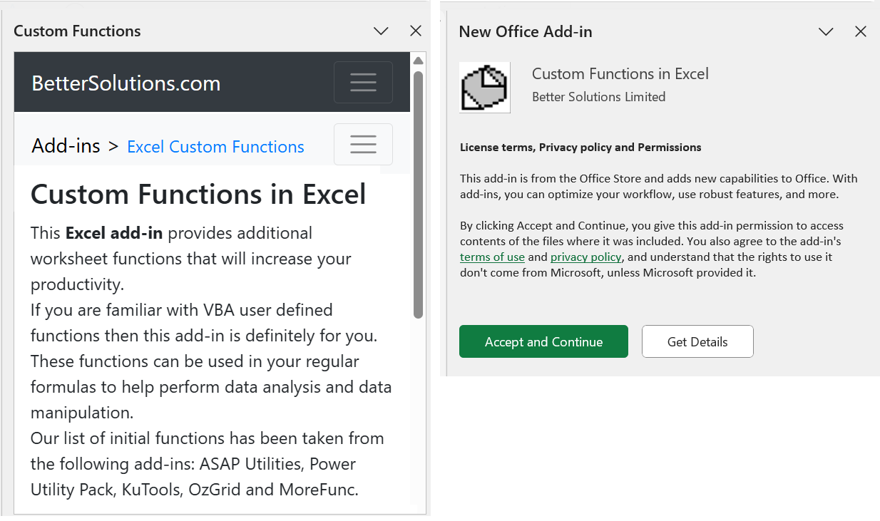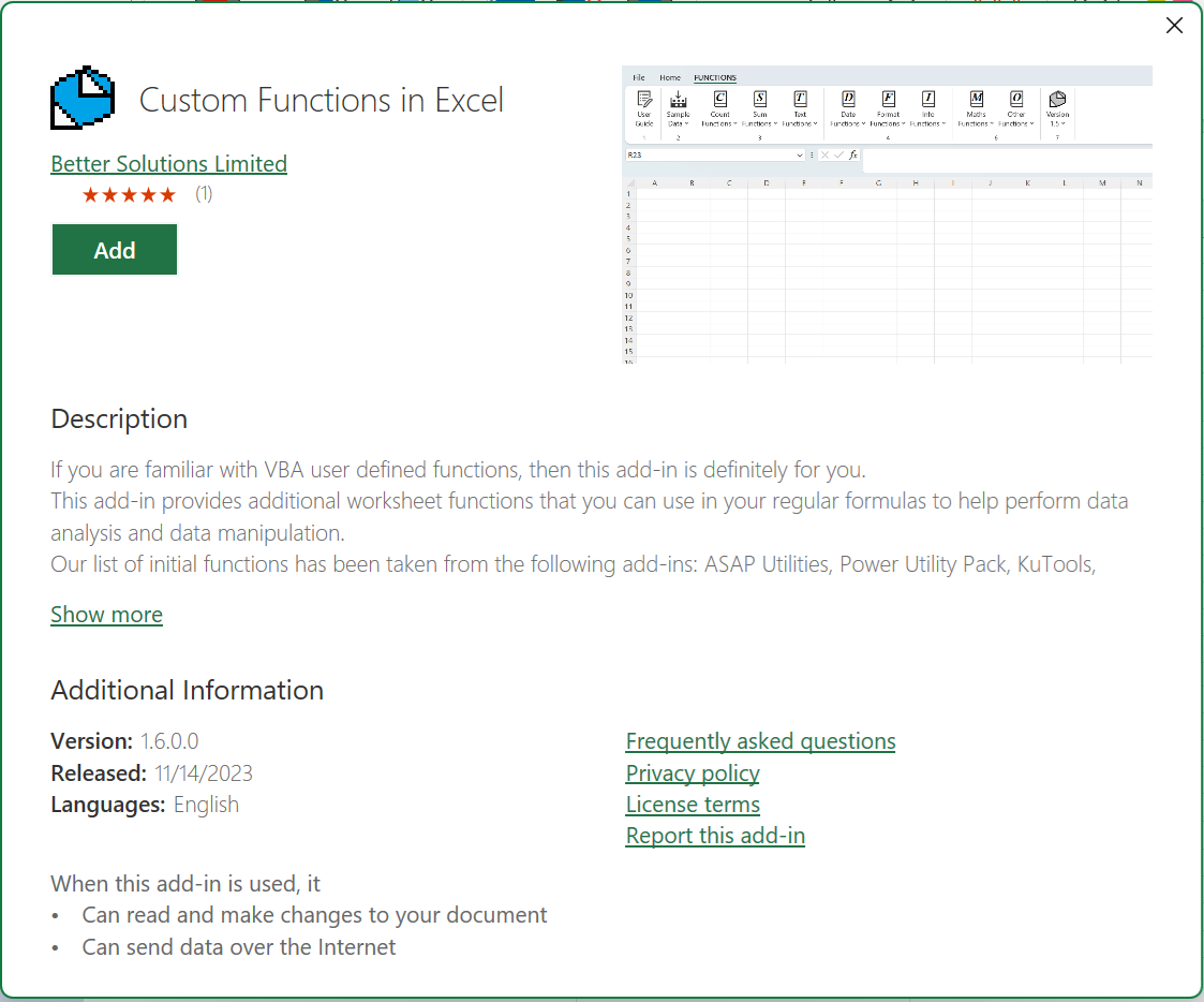 If you select the add-in you will see the following information.