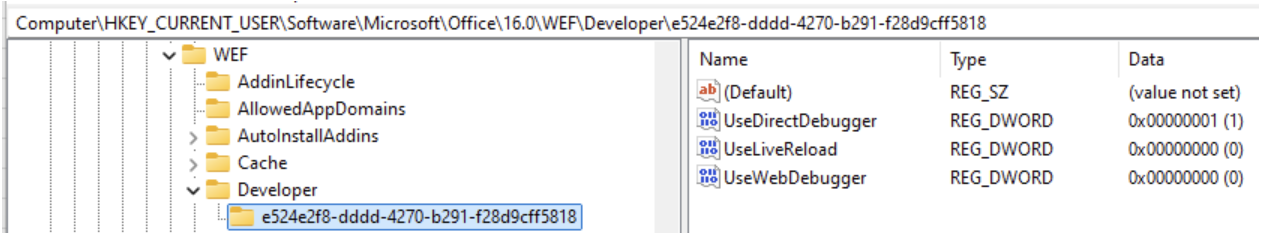 HKCU\Software\Microsoft\Office \ 16.0 \ WEF \ Developer \ "addin GUID" \ UseDirectDebugger