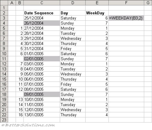 The formula in cell "C3" returns the next working day (assuming a 6 day working week) that is 10 days after 25/12/2004.
