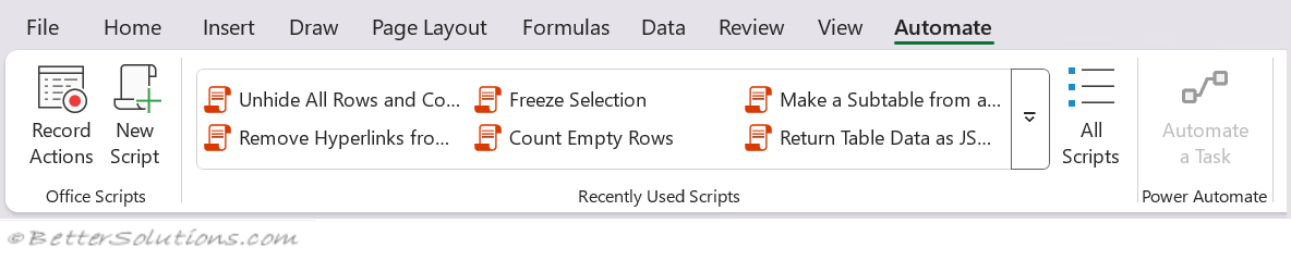 Once Office Scripts has been enabled by your administrator you will see an additional tab called "Automate".