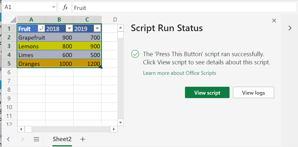 If the script is able to run successfully this will be indicated in the task pane.