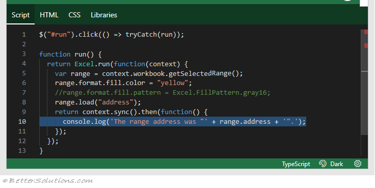 In the "Basic API call (JavaScript)" sample, the address of the cells selected is written to the console at the end.