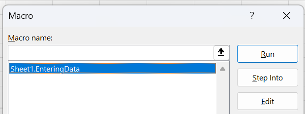 On the Developer tab, select Macros, select "Sheet1.EnteringData" and press Run.