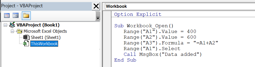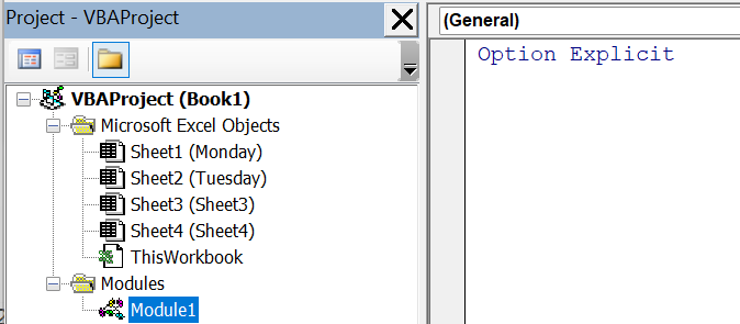 In the screenshot below, the Project window shows there is only one workbook open called "Book1".