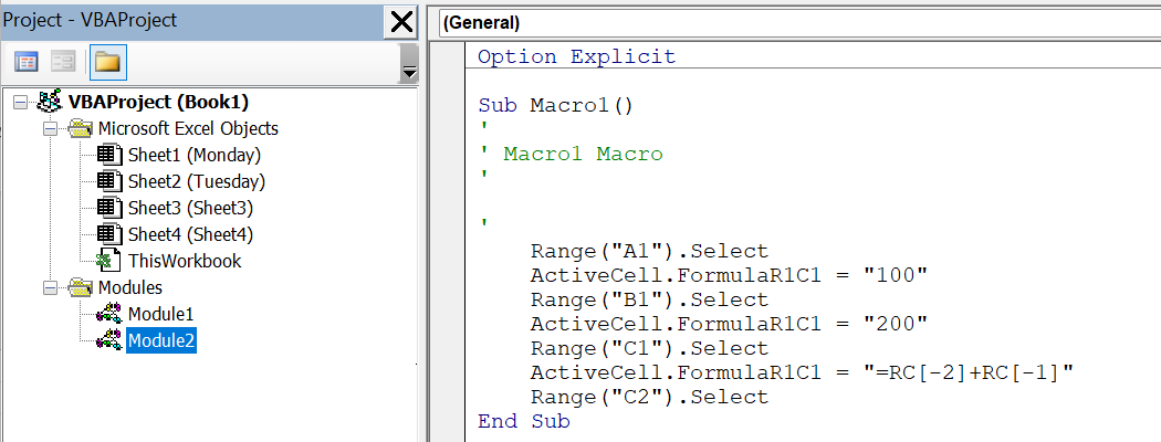 Here we are going to add a macro to the workbook and put this macro into an independent code module.