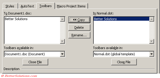 Press the Copy button to copy the toolbar from the Normal.dot template to Document1.doc.