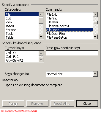 For example if you tried to assign the shortcut key (Ctrl + O) to a command then it would indicate that this already assigned to the FileOpen command.