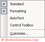 To quickly display a toolbar, press the Right mouse button when over a menu or toolbar to display the (View > Toolbars) list.